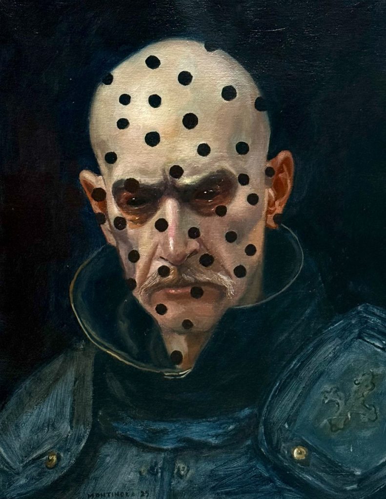 Montinola depicts figures as phantoms, using painting to connect everyday reality with the unseen—whether it be hidden emotions, subconscious layers, or intangible presences. Through universal themes such as existence and the soul, he gives form to the invisible. His works often combine references to medieval and Renaissance European painting with characters of his own creation, embedding narratives and myths behind each figure. In doing so, he links fiction and reality, and reveals the tension between what is visible and what lies beneath.